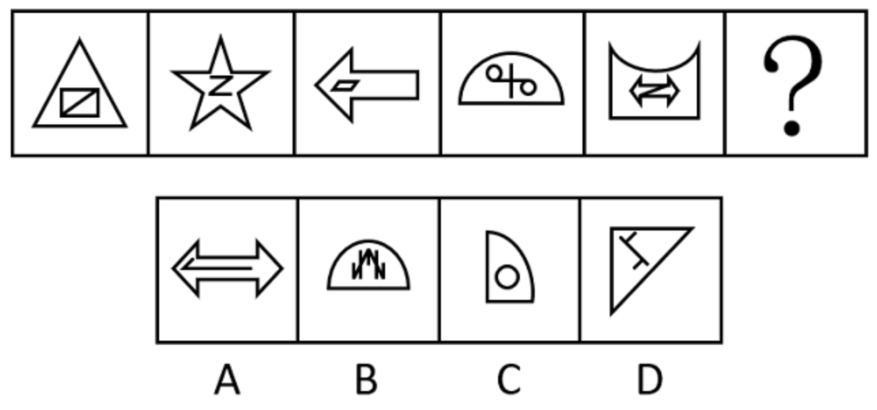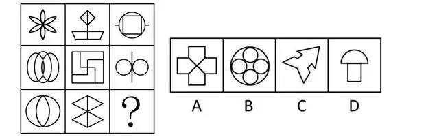 解析:元素组成不同,优先考虑属性规律。观察发现,题干图形均为轴对称图形,并且对称轴方向每次顺时针旋转,排除A项和C项。进一步观察发现,题干中图1、图3和图5的对称轴都与图形中的一条线重合,而图2和图4的对称轴没有与图形中的一条线重合,故"?"处应选择一个图形的对称轴不与图形中某一条线重合的,只有B项符合。