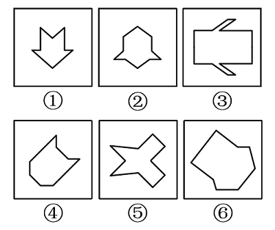 解析:对称、曲直均无明显规律,考虑开闭性。图①④⑥均为半开半封闭图形,图②③⑤均为全封闭图形。因此,图①④⑥为一组,图②③⑤为一组。