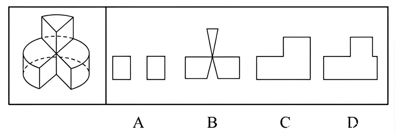 截面图题目的典型特征是给出一个立体图形(如正方体、圆柱、圆锥或组合体),要求判断用平面切割该图形后,切口处的断面形状是什么;或者反过来,给出几个平面图形,要求判断哪个不可能是该立体图形的截面。这类题目考查的是空间切割想象能力和截面形状判断能力。