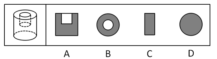 - B项:同心圆,横着经过内部圆柱可以切出。此时内部圆柱没有暴露在外面,属于挖空部分,所以截面中间有实线是正确的,排除